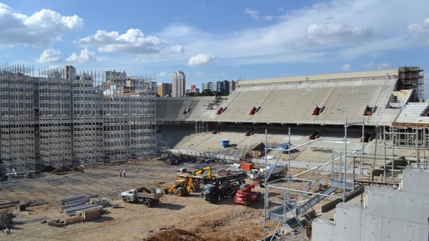 O clube também prepara para iniciar a instalação da cobertura. A Arena da Baixada será o único estádio brasileiro com uma cobertura retrátil. Os funcionários vão instalar 19 torres de cada lado - 11 dentro do campo e 8 sobre as arquibancadas. Por enquanto, eles estão fazendo as montagens no Setor Getúlio Vargas. Depois, eles vão iniciar no setor Brasílio Itiberê. Confira, a seguir, imagens da obra: